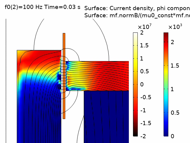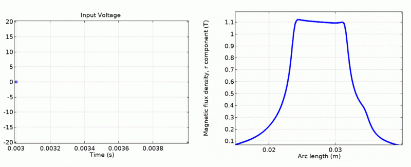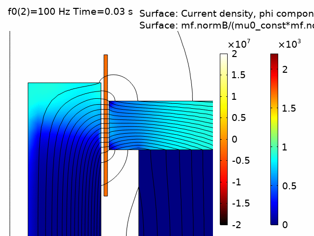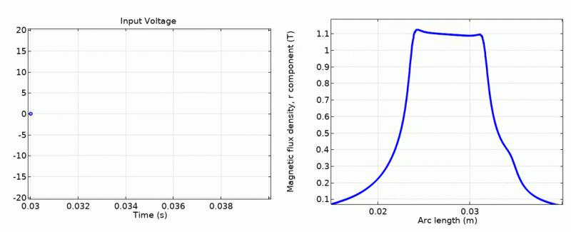 GIF 01. È visibile come la densità di flusso radiale nel traferro varia in accordo alla tensione di pilotaggio sia a 100 che a 1.000 Hz.