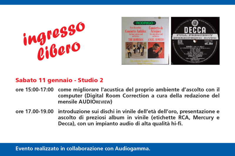 AUDIOreview sarà presente il giorno 11 gennaio 2020 all’Auditorium Parco della Musica di Roma (Studio 2 al piano -1) per illustrare e far ascoltare preziosi dischi in vinile dell’età dell’oro (Decca, Mercury, RCA) ma anche le recenti tecnologie per la correzione digitale dell’ambiente d’ascolto. Un’occasione da non perdere per parlare di musica, acustica ambientale e tecnologie audio con i redattori della rivista.