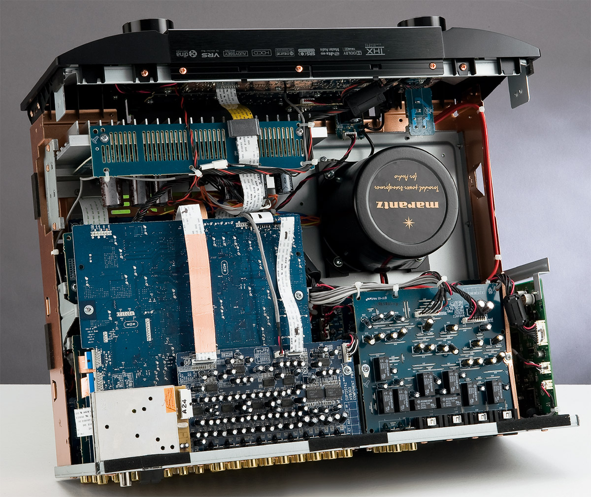 Il volume interno rimanente (circa 3/4 del totale) è invece densamente sfruttato. A ridosso della parte sinistra del pannello posteriore, sulla quale è ospitata la maggior parte dei connettori, sono infatti presenti, oltre alla scatolina metallica contenente i componenti del sintonizzatore, ben cinque schede orizzontali sovrapposte. Queste ultime sono dedicate, procedendo dall’alto verso il basso, al trattamento dei segnali video component, dei segnali video digitali, dei segnali video composito e SVideo, dei segnali audio digitali e, infine, dei segnali audio analogici di ingresso.