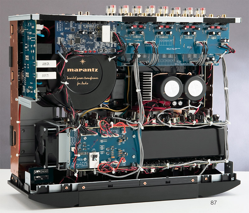 La parte centrale del pannello è invece in metallo ed è caratterizzata da una finitura che appare un po’ più lucida di quella delle parti laterali. Passando ad esaminare l’interno del finale, trova conferma la buona impressione avuta con il pre e l’attenzione che tradizionalmente Marantz dedica alla realizzazione delle amplificazioni audio. La sezione di alimentazione si avvale di un imponente trasformatore toroidale che arriva ad occupare quasi un quarto del volume interno dell’apparecchio. Il filtraggio dell’alimentazione può contare su ben 100.000 microfarad di capacità totale che sono concentrati in due soli condensatori prodotti per Marantz dalla Nichicon.