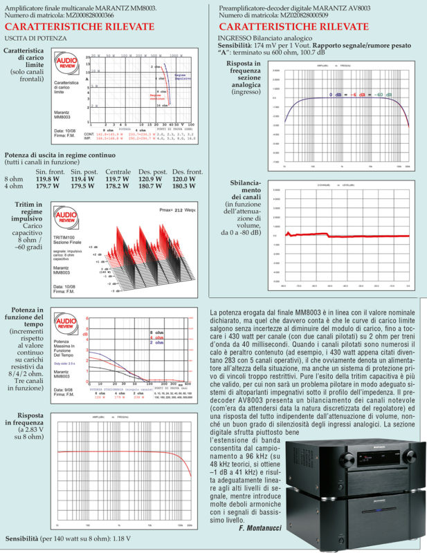All’ascolto la coppia AV8003-MM8003 non tradisce le attese e dimostra di ben rappresentare il vertice dell’amplificazione multicanale Marantz. La sezione analogica esibisce infatti un suono timbricamente sano, ben dettagliato e, nell’ascolto in stereofonia, credibile per ciò che concerne la ricostruzione dell’immagine. In tale modalità di utilizzo risulta vantaggioso attivare la funzione pure-direct che fa percepire con maggior nettezza i pregi della riproduzione sopra elencati. Sempre in stereofonia, la capacità di pilotaggio della sezione finale si dimostra più che buona anche in presenza di carichi piuttosto difficili.