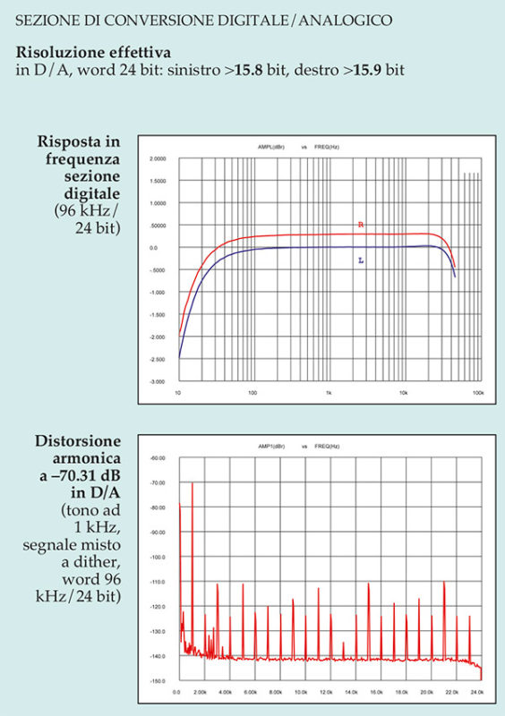 digitale sfrutta piuttosto bene l’estensione di banda consentita dal campionamento a 96 kHz (su 48 kHz teorici, si ottiene –1 dB a 41 kHz) e risulta adeguatamente lineare agli alti livelli di segnale, mentre introduce molte deboli armoniche con i segnali di bassissimo livello.