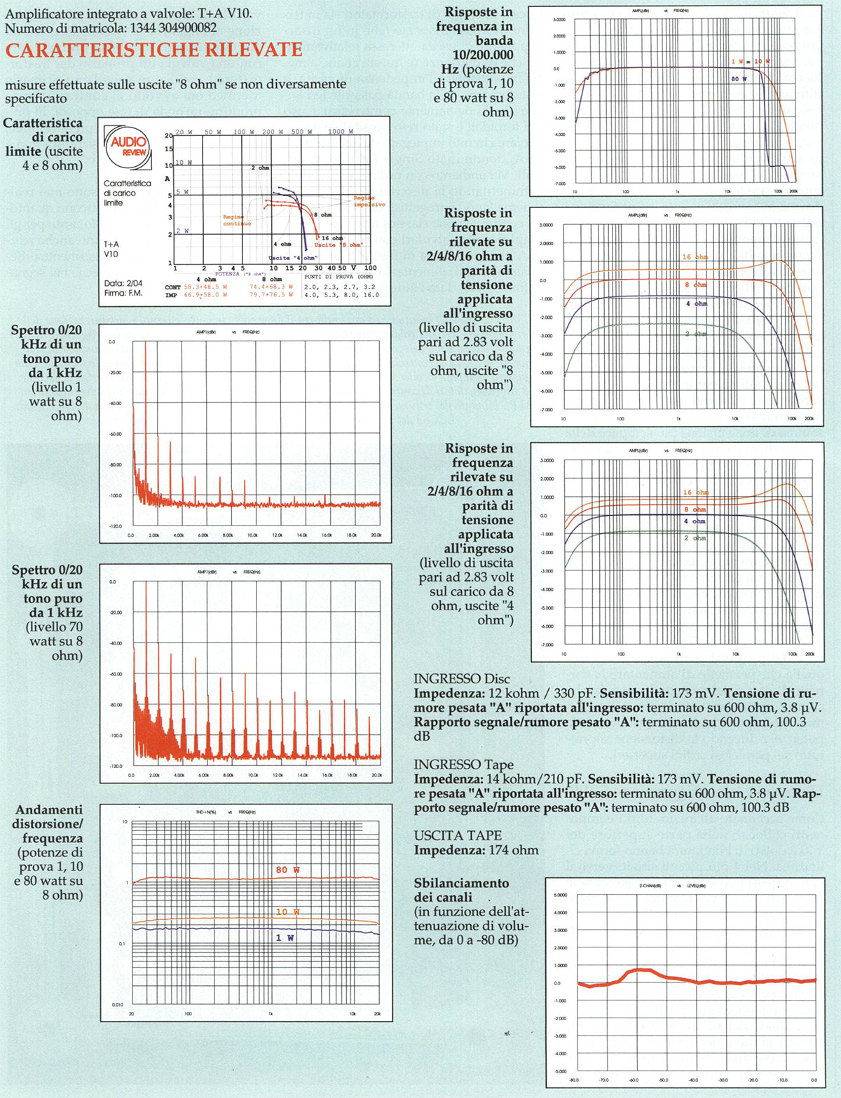 A differenza dello stato solido, nelle amplificazioni valvolari non è così difficile mettersi in laboratorio ed andare alla ricerca dei punti deboli, anche per verificare la consistenza progettuale dell’insieme. Questi componenti sono soggetti a tante limitazioni intrinseche che la realizzazione di un finale realmente prestante è operazione quasi da funambolo, in cui basta un errore od un eccesso di risparmio su singoli elementi per compromettere il risultato d’insieme. Nel caso del V10 abbiamo più elementi che concordano nell’indicare che i risultati conseguiti sono prossimi al massimo, e che le scelte operate sono state azzeccate. Guardiamo ad esempio alle risposte: per la loro natura reattiva mista, tutti i trasformatori sono soggetti