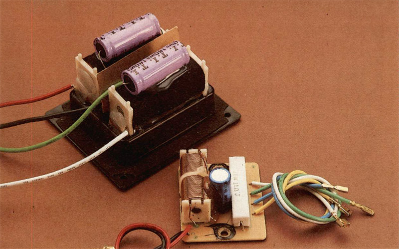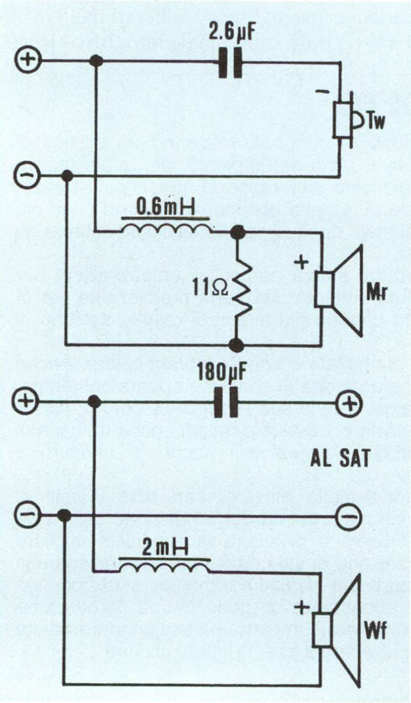 Il filtro crossover, molto semplice in quanto utilizza solo tagli a 6 dB/ottava, è diviso in due parti: quella che comprende le circuitazioni relative al taglio inferiore è posta nel subwoofer, mentre i satelliti accolgono al loro interno i circuiti relativi all’incrocio tra mid e tweeter. Il cablaggio dei satelliti è su basette di circuito stampa