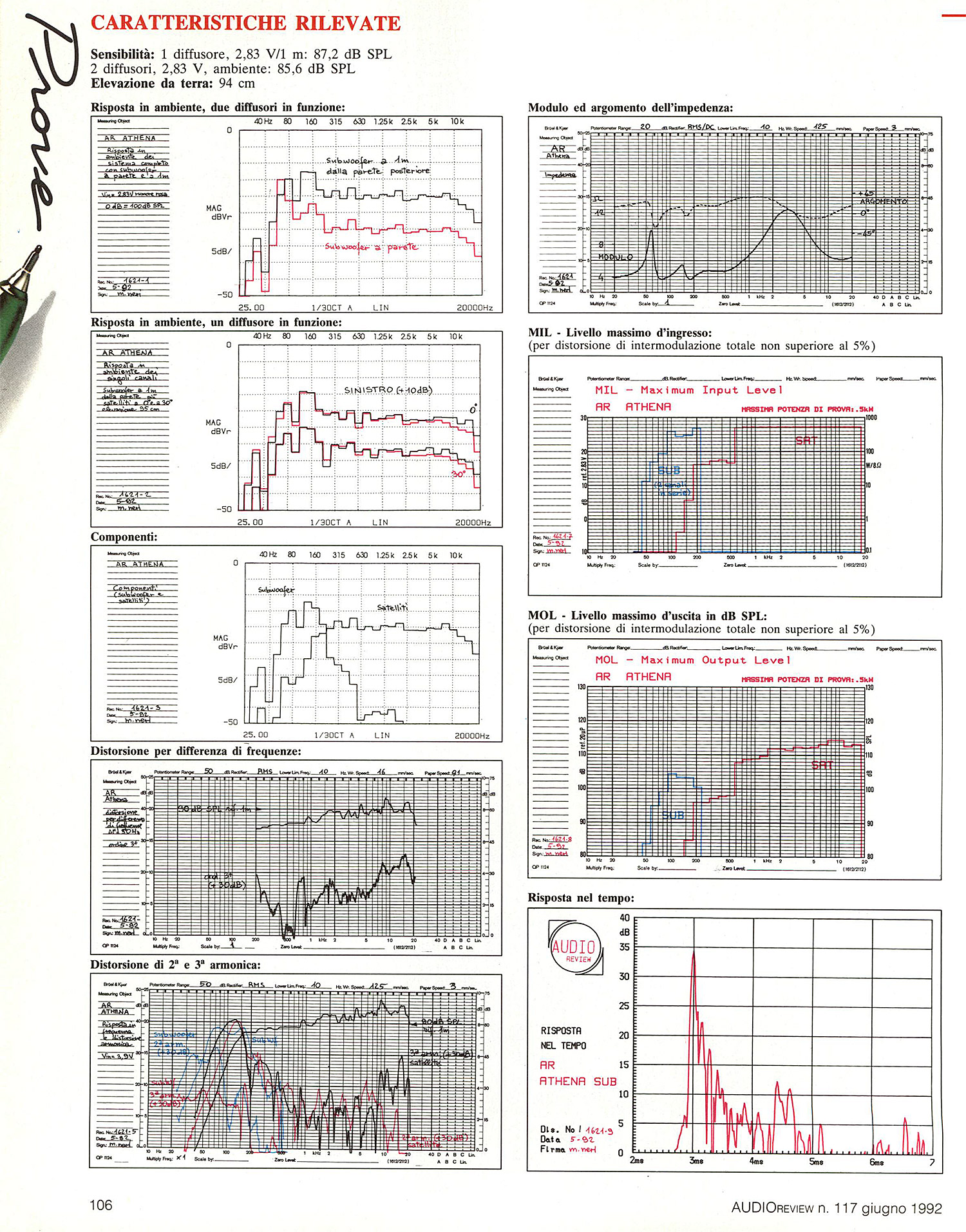 Alle consuete misure di MIL e MOL il sistema AR Athena, ad onta delle piccole dimensioni, si è comportato in maniera esemplare. Il sub riesce ad emettere i 100 dB già a partire da 80 Hz, mentre il satellite presenta un livello prossimo a questo già da 320 Hz in su.