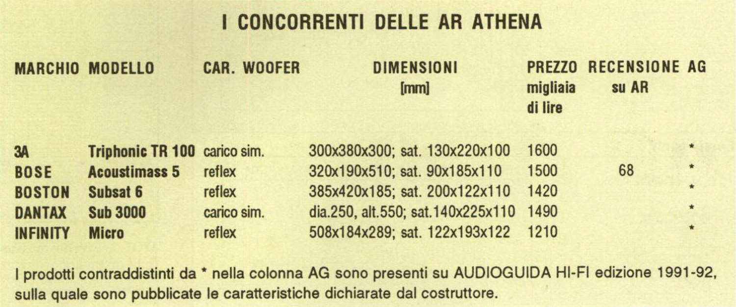 Date le dimensioni più che contenute di questo sistemino AR Athena, per la prova di ascolto ho dovuto ingegnarmi realizzando, con una buona quantità di riviste trafugate dal nostro magazzino, una coppia di supporti su cui porre i minuscoli satelliti. La collocazione più naturale del sub mi è sembrata quella a parete, cioè con il fondo del mobile appoggiato alla parete di fondo della stanza in modo che i due condotti di accordo presenti si trovassero ad una distanza di circa 30 cm da quest’ultima e praticamente a ridosso del pavimento. I satelliti sono stati anch’essi addossati alla parete anteriore, se non altro per minimizzare l’effetto delle riflessioni provenienti da quest’ultima. Per rompere il ghiaccio metto sul platorello del CD un bel disco di musica sinfonica e precisamente la «Nona Sinfonia» di Beethoven in una bellissima incisione della Telare. La scena è incredibilmente reale, con gli strumentisti ben disposti sia sul piano orizzontale che su quello verticale. L’impressione di naturalezza che ne deriva è eccezionale; l’impatto e la dinamica, specialmente considerando da dove esce il suono, lo sono altrettanto. Sembra davvero di essere al cospetto di un sistema di dimensioni ragguardevoli e suggerisco, a chi si diverte a fare degli innocenti scherzi, di nascondere il tutto dietro ad una tenda trasparente al suono ma non alla vista, ed invitare l’amico audiofilo superappassionato e super-esperto ad una seduta di ascolto: «Michele (gli esperti si chiamano tutti così), tu che sei un intenditore, dimmi che razza di sistema di riproduzione è questo?». Mi gioco la camicia che Michele, pur essendo così esperto a riconoscere il classico suono degli altoparlanti AR, non riuscirà a capire che ha davanti un sistemino sub più microsatelliti, e sarà pronto a mettere la mano sul fuoco di aver ascoltato una coppia di AR M6! Dopo questa digressione giocosa passo all’ascolto di vari brani di musica rock e jazz, come l’ultimo disco di Michael Jackson «Dangerous», ottimamente inciso, ed il mio preferito «Stili Life Talking» di Pat Metheny. Con tutti posso notare la notevole dinamica restituita e l’eccezionale ricostruzione della scena sonora. La timbrica è corretta, con i piatti ben in evidenza ma mai affaticanti, con bassi profondissimi ed ottimamente frenati, con medi naturali e limpidi.