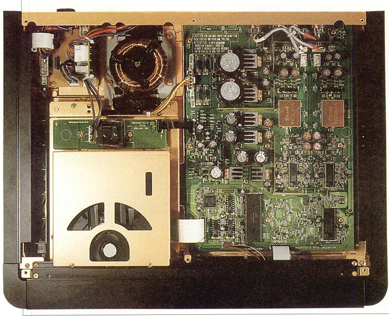 Veri e propri minuscoli scudi in lamierino di rame – già visti in molte delle realizzazioni top di Marantz – bloccano addirittura le emissioni da e verso i dispositivi monolitici degli stadi di regolazione di tensione, peraltro numerosi ed indipendentemente dedicati alle sezioni più critiche del circuito, mentre un guscio in lamiera placcata protegge l’intero gruppo di lettura. Complessa e mirata alla massima inerzia rispetto ai fenomeni vibrazionali di natura sia endogena che esogena, la struttura composita del telaio, attuata attraverso un pianale portante in pressofusione con nervature di rinforzo, sul quale sono fissati il sub-telaio dedicato all’ancoraggio del gruppo optomeccanico, un collaudatissimo CDM 12.1; i trasformatori delle sezioni analogiche e digitali; l’elettronica di elaborazione e servizio; le paratie che, assemblate assieme, costituiscono la carrozzeria vera e propria.