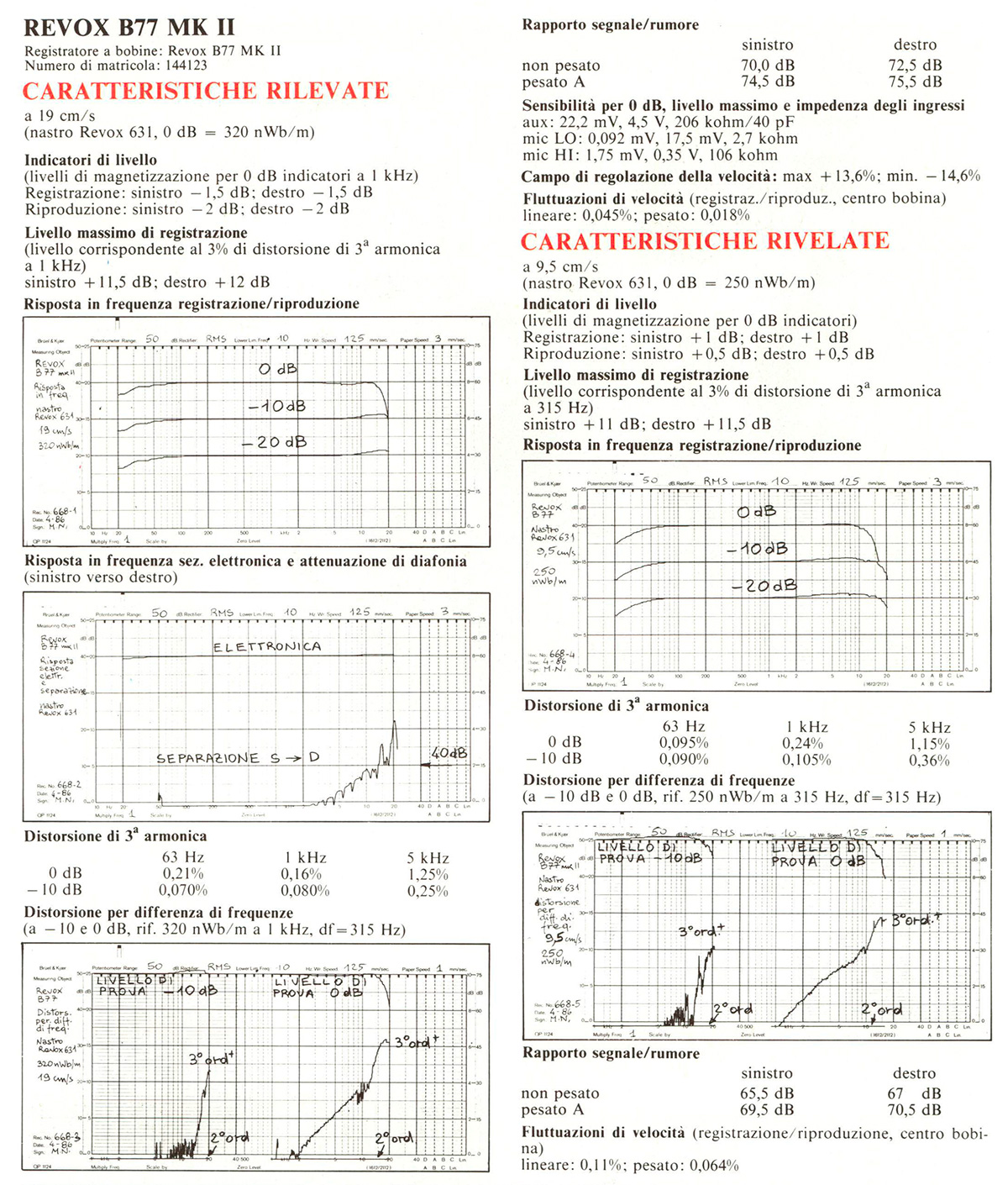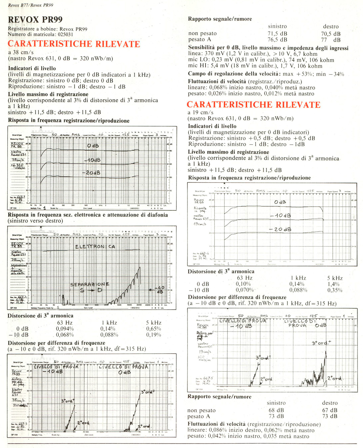 Confrontando le prestazioni delle due macchine a 19 cm/s, emergono puntualmente le differenze appena indicate: la distorsione per differenza di frequenze del PR99 è (in particolare a 0 dB) nettamente inferiore a quella del B77. Considerato che a -10 dB le differenze si riducono, è ragionevole ipotizzare che il miglioramento delle prestazioni ad alto livello del PR99 sia da attribuire non solo alla diversa equalizzazione, ma anche, presumibilmente, alla diversa circuitazione.