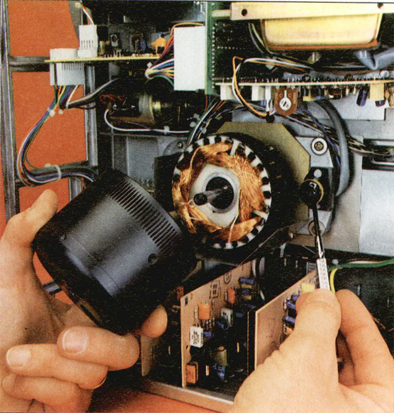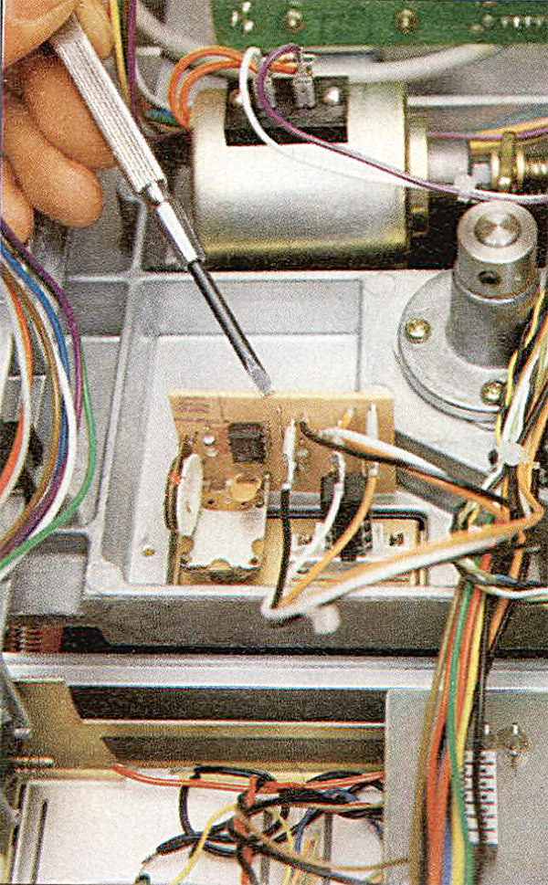 Nella foto sono visibili le tacche di riferimento sul rotore del motore del capstan; il cacciavite indica la testina magnetica