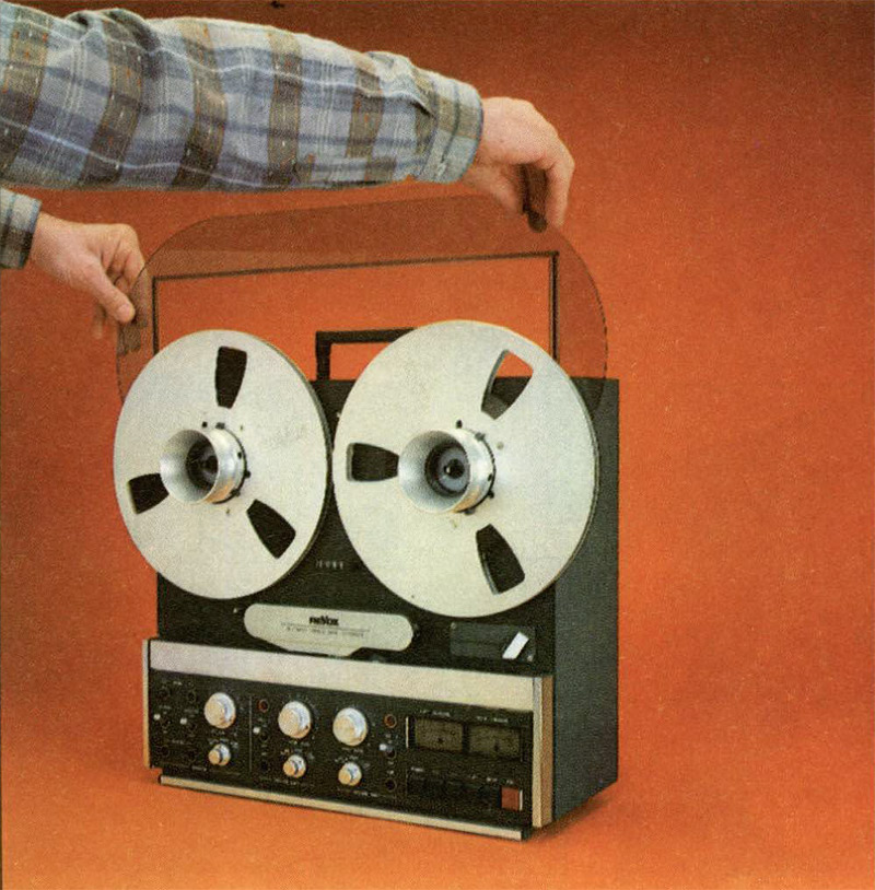 Inutile dilungarsi su ciò che le fotografie dicono meglio di molte parole, solo qualche commento e qualche chiarimento: il rivestimento della piastra frontale è in plastica antiurto, mentre il mobile contenitore è realizzato in polistirolo indeformabile in unico pezzo, ricoperto di una particolare sostanza prodotta dalla 3M chiamata Nextel che da alla superficie un aspetto “feltroso”, ed è dotata di caratteristiche antiriflesso ed antigraffio. La linea dell’apparecchio è studiata in funzione dello styling generale della produzione Revox, nel senso che è coordinata con esso ed è caratterizzata da motivi stilistici, come il frontalino rettangolare sormontato dalla fascia orizzontale di alluminio anodizzato, che si ripetono in maniera praticamente modulare in tutti gli apparecchi della gamma, ogni qualvolta la loro struttura lo consente.