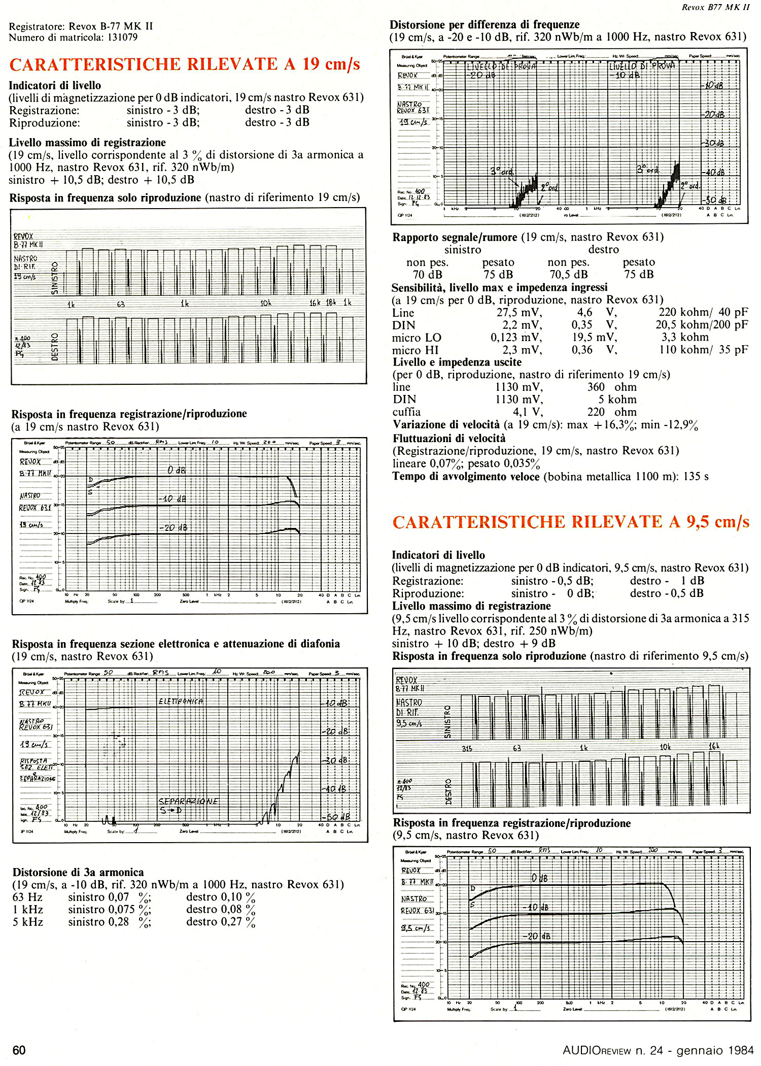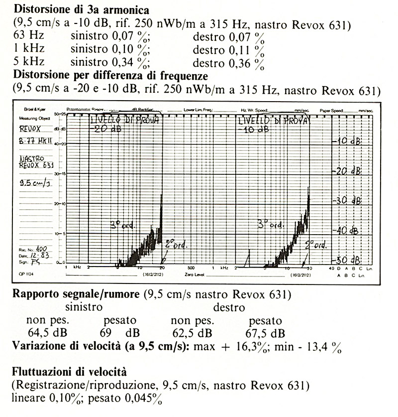riferimento cui siamo abituati. I rapporti S/N che scaturiscono dal rapporto MOL/rumore di fondo sono dell’ordine dei 75 dB in misura pesata, a 19 cm/s. A differenza di quanto accade con i registratori a cassetta, questi valori di S/N non crollano rapidamente con il crescere della frequenza, come si vede dalle curve di risposta, che sono praticamente ancora “fiat” a 15 kHz, al livello di prova di 0 dB! Molto basse poi la distorsione, anche a 9,5 cm/s ed al livello di prova di -10 dB, e le fluttuazioni di velocità che, notiamo, sono state rilevate nella condizione d’uso effettivo, in registrazione/riproduzione.