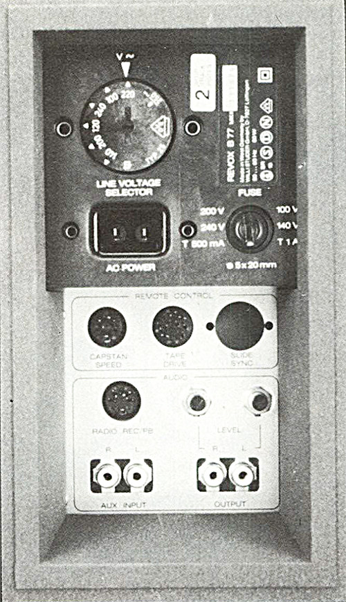 per accedere comodamente al gruppo medesimo. Nella parte inferiore del frontale, sul pannellino rettangolare, troviamo riuniti tutti i controlli fondamentali del registratore: sul lato sinistro i controlli della sezione di monitor ed il cambio di velocità del nastro, al centro gli elementi attinenti alla registrazione, congli ingressi microfonici, sul lato destro i due VU meter con gli indicatori di picco a LED e pulsantiera di comando della meccanica. Sul retro è disposto un pannellino incassato recante il cambiatensione, i connettori del telecomando, del variatore di velocità esterno ed il foro cieco predisposto per l’applicazione del connettore per il dispositivo di controllo del proiettore di diapositive. Sono inoltre presenti la presa di rete ed il portafusibile, nonché i controlli di livello a trimmer ed i connettori in/out in versione DIN ed a pin jack. A questo punto è di prammatica il commento fisso che si fa sui connettori pin del registratore Revox: non si è mai capito perché, (e forse la risposta ce la potrebbe dare solo Willi Studer, il costruttore, che però non sembra molto propenso alle interviste), ma sia sull’A 77 che sul B 77 i pin jack dei due canali sono montati vicinissimi tra loro, tanto che, per non avere problemi, è necessario impiegare i vecchi pin jack “nudi” di una volta; con gli attuali connettori rivestiti di plastica è sempre necessario forzare per riuscire a far entrare due connettori affiancati. Daccordo, è cosa di poco conto… ma appunto perché lo è, perché non viene risolta? Sono dieci anni
