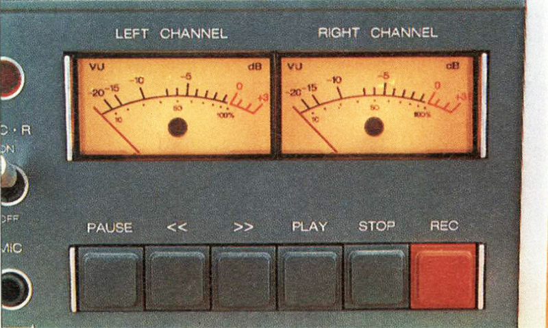 Sul lato destro i VU meter illuminati con indicatore di picco a LED; al disotto i pulsanti di controllo della meccanica.