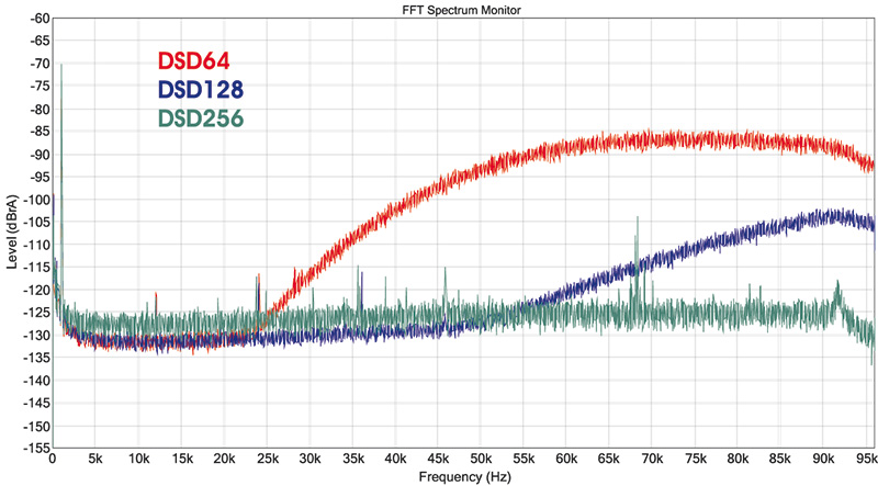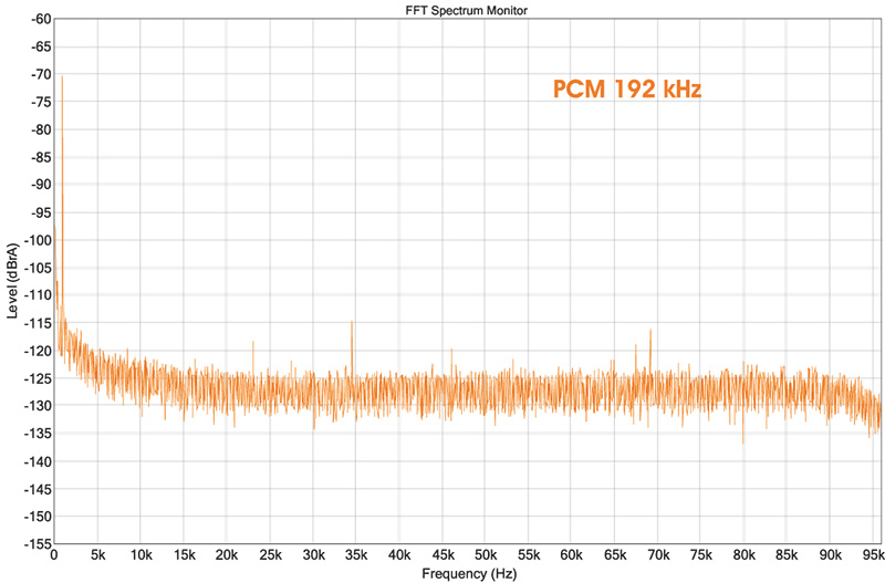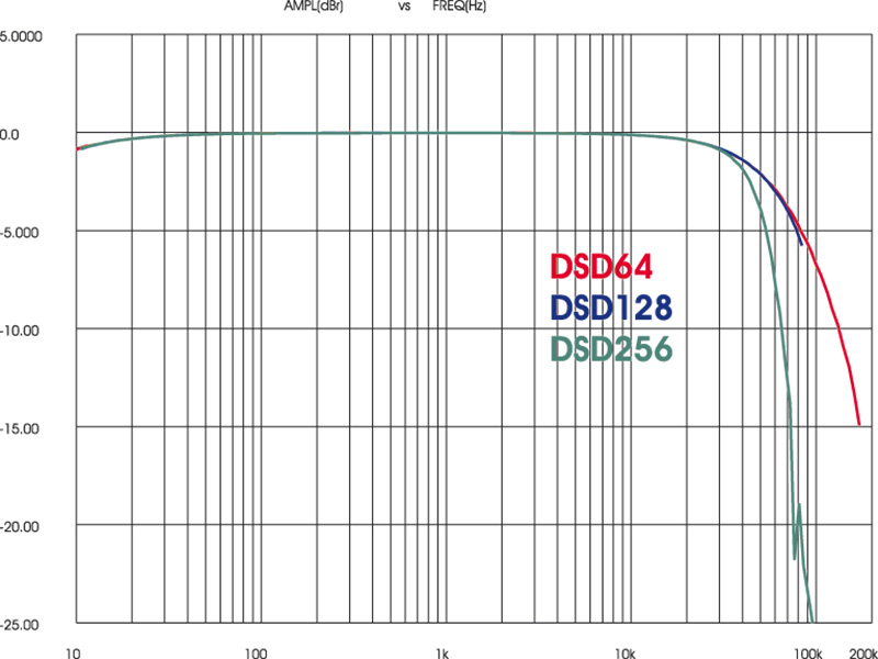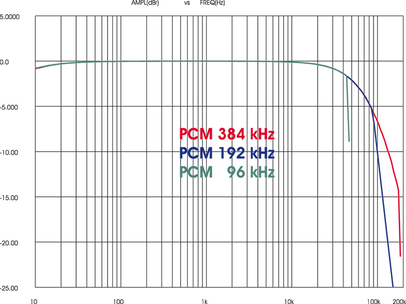 Per confronto riportiamo anche la risposta in PCM. L’estensione utile a 192 kHz di Fs equivale a quella ottenuta in DSD128, e quella a 384 kHz equivale all’estensione utile in DSD256.