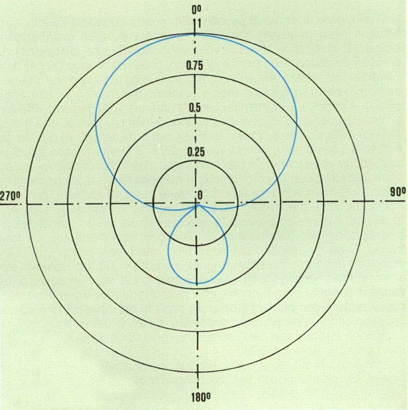 Un caso importante si ha con A=0,5: si ottiene una caratteristica polare cardioide (figura 3), caratterizzata da un solo massimo di sensibilità sull’asse e da un solo zero a 180°.