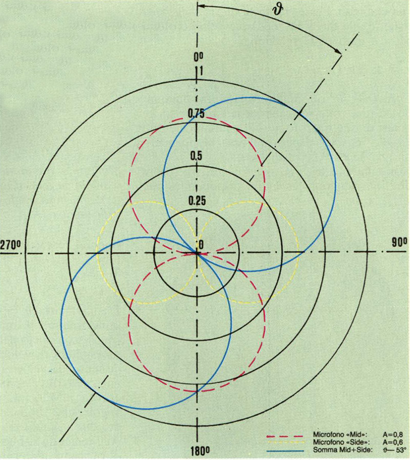 L’equivalenza è facilmente comprensibile se immaginiamo il microfono direttivo centrale (mid) scomposto nelle due sue componenti di pressione e di velocità: la somma della componente di velocità di M con il segnale S, anch’esso di velocità, risulta in un microfono, ancora a velocità, con l’asse ruotato di un