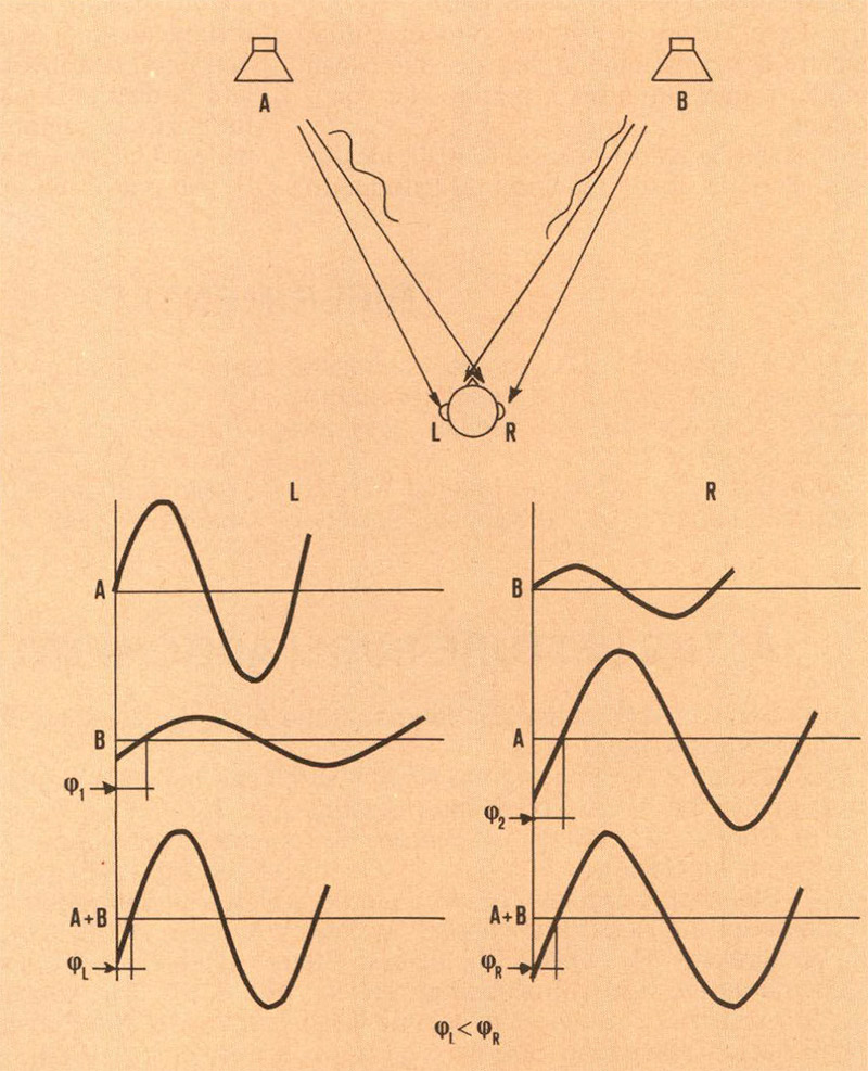 Le combinazioni dei due suoni ricevuti da ciascun orecchio risultano tuttavia in due segnali, aventi la stessa ampiezza, ma sfasati tra loro di un certo angolo, come nell’ascolto dal vivo.