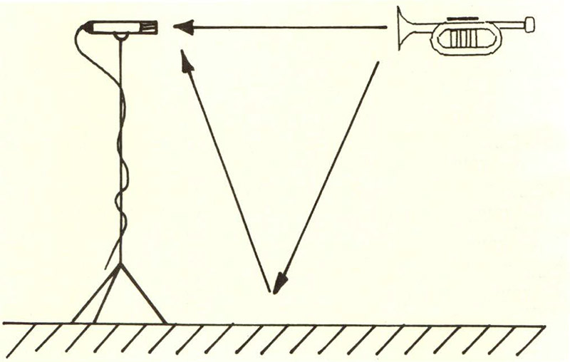 Lo scopo dichiarato di tale arrangiamento è l’eliminazione di presunti effetti negativi dovuti alla sistemazione tradizionale dei microfoni: un microfono montato su di un’asta raccoglie, dopo il suono diretto, anche la riflessione sul pavimento (vedi fig. 8) con il conseguente effetto di filtraggio a pettine; avvicinando il più possibile il microfono al pavimento si spostano le frequenze di notch al di sopra della banda udibile. Personalmente ritengo che le riflessioni sul pavimento (o altre analoghe) contribuiscano alla localizzazione ed alla percezione della dimensione spaziale dell’evento musicale, e pertanto vadano mantenute nella registrazione.