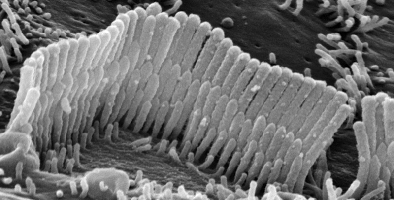 Lungo la coclea sono distribuiti circa 16.000 ricettori; ogni ricettore è collegato in un elevato numero di cellule ciliate che varia dalle 50 alle 100 unità per ricettore (Figura 5), ognuna delle quali ha la capacità di risuonare ad una determinata frequenza, e se all’interno della vibrazione è presente quella frequenza la cilia “entra in risonanza” inviando uno stimolo elettrico ad alcune cellule poste in determinate aree della corteccia cerebrale.