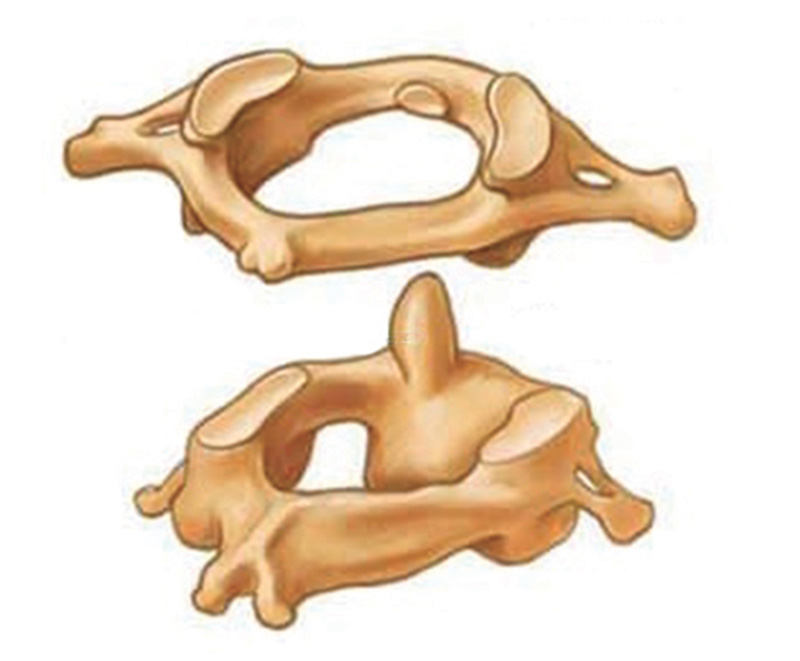 Figura 10 - La struttura ossea alla base del cranio si compone di due parti: la prima vertebra cervicale vera e propria sormontata dall’atlante che ne limita pericolose oscillazioni. In pratica le ossa della testa poggiano su una punta, il dente epistrofeo.