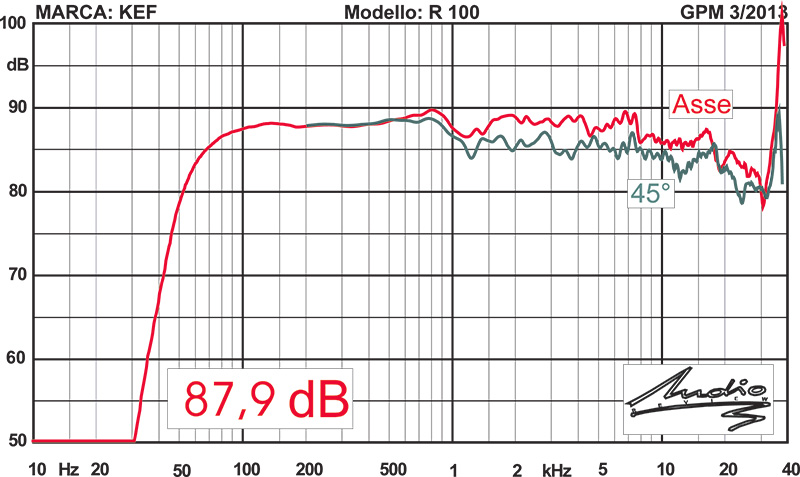 Figura 11 - Il grafico mostra la tipica risposta di un tweeter a cupola metallica con una pronunciata risonanza oltre i 20 kHz.