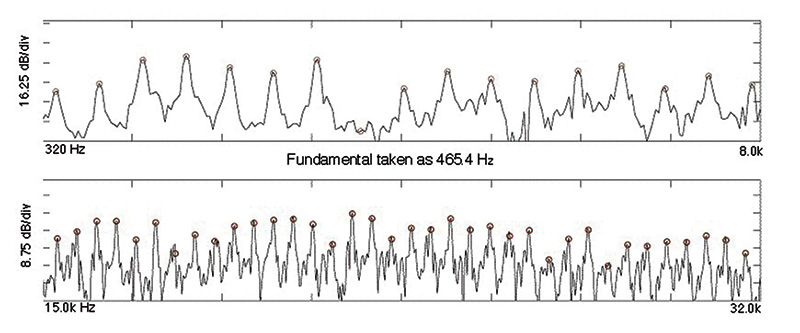 In Figura 1 è presente l’immagine dello spettro in frequenza di una nota di tromba con sordina ripresa a poco più di un metro di distanza. Si nota con chiarezza che la fondamentale è posta piuttosto in basso, a 465,4 Hz, con un picco massimo posto a circa 2.000 Hz del valore di 90,8 dB. Si può notare nel grafico come il suono resti a livelli elevati anche nella banda delle frequenze ultrasoniche, tanto che a 50 kHz risulta di circa 12 dB superiore al livello del rumore di fondo. I numerosi picchi con andamento decrescente sono le armoniche, individuate con maggiore precisione nelle Figure 2 e 3.