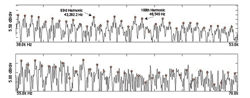 Infine, la Figura 3 evidenzia la porzione di spettro dai 38 ai 53 kHz, che riporta il conteggio delle armoniche, con la numero 100 posta a 45.560 Hz.
