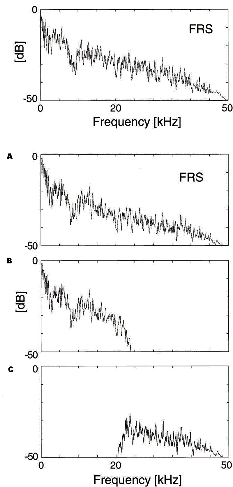 Il brano scelto è una musica tipica delle isole di Bali, prodotto da un’orchestra “gamelan”, ricca di strumenti che producono alte frequenze e registrato con un set di microfoni, pre e alimentatori B&K, un convertitore AD/DA ad 1 bit e frequenza di campionamento posta a 1,92 MHz ed un adeguato registratore digitale. Questo segnale che si estende sino ai 50 kHz è stato diviso in due parti, ponendo come frequenza di separazione i 22 kHz, creando così la terna di segnali in Figura 6: il primo a banda intera (A), il secondo al di sotto dei 22 kHz (B) ed il terzo superiore ai 22 kHz (C).